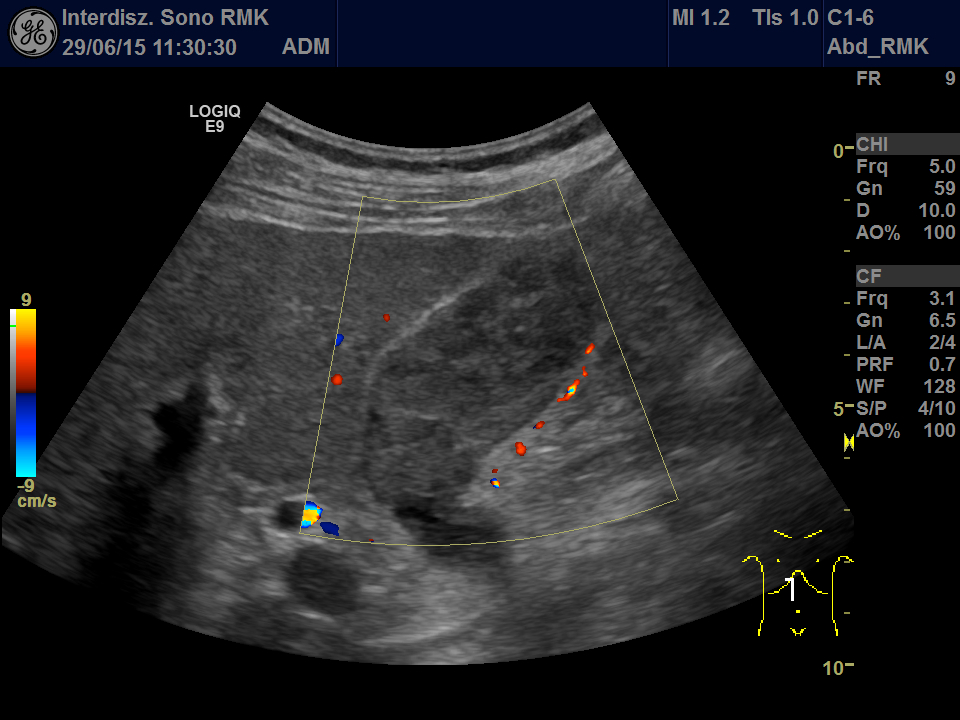 Video 2: Second look using the linear array and Doppler: Using low PRF several arterial branches inside the gallbladder can be detected. Note the inhomogeneity of the echos in the lumen.