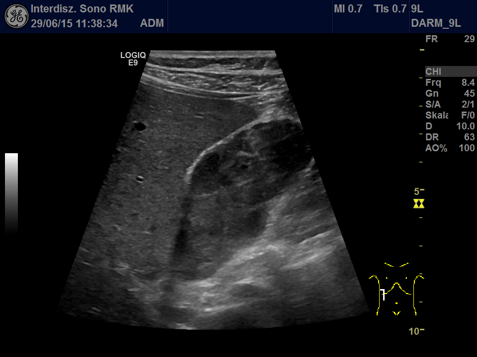 Figure 2: Second look using the linear array: Note the inhomogeneity of the echos in the lumen. Left side position does not cause any changes. Also note the well preserved wall of the gallbladder.