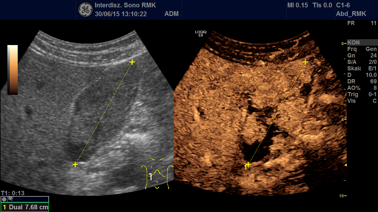 As shown in this case CEUS is even more sensitive in detecting tumor vascularization. CEUS in case of doubt is an excellent and reliable tool to distinguish between tumor tissue, sludge and concrements.