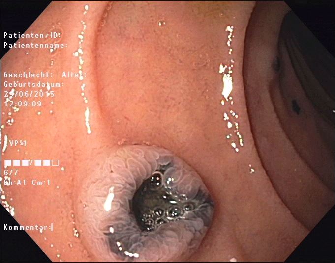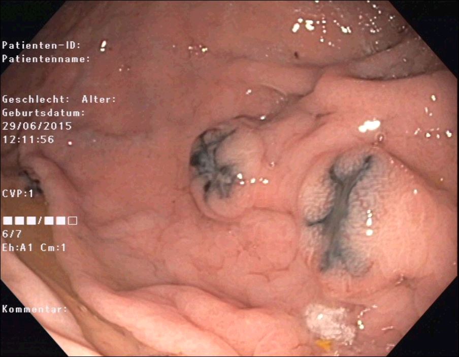 Unfortunately, the following endoscopy revealed multiple metastases in the stomach, duodenum and colon (Fig. 4-6) that endoscopically and histologically confirmed as metastasis of a malignant melanoma.