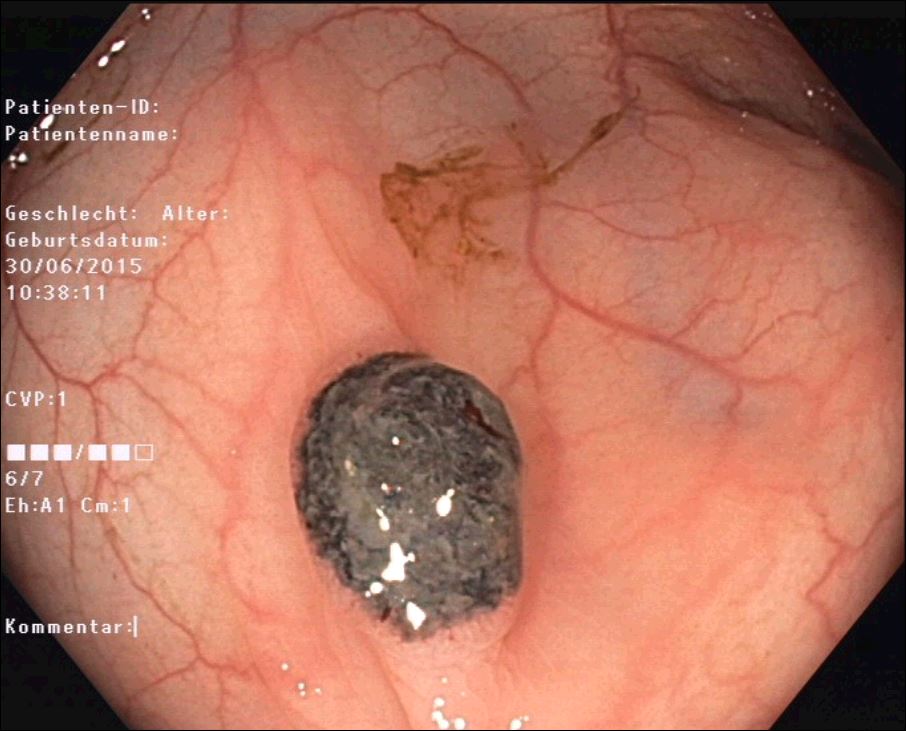 Figure 5: Polypoid melanoma metastasis in the stomach. Typical black color.