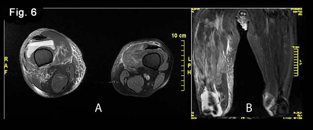 Axial (A) and coronal (B) ΜR image of the injured muscles and suprapatellar recesses