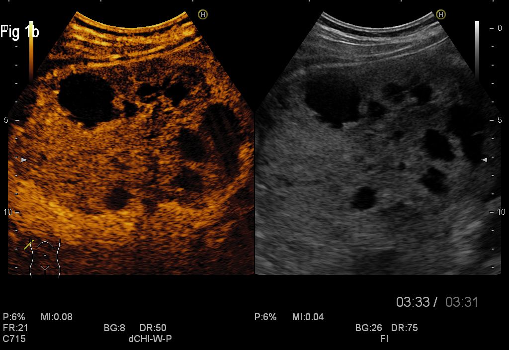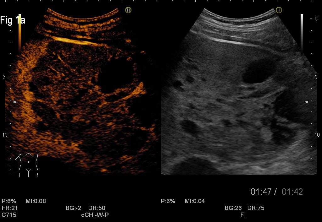 Figure 1a,1b. CEUS of the secondary cystic liver masses in the late venous phase