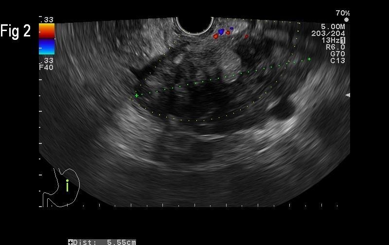 Figure 2. EUS demonstrates the primary tumour in the pancreas as a heterogenous hypo-and hyperechoic mass