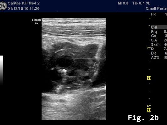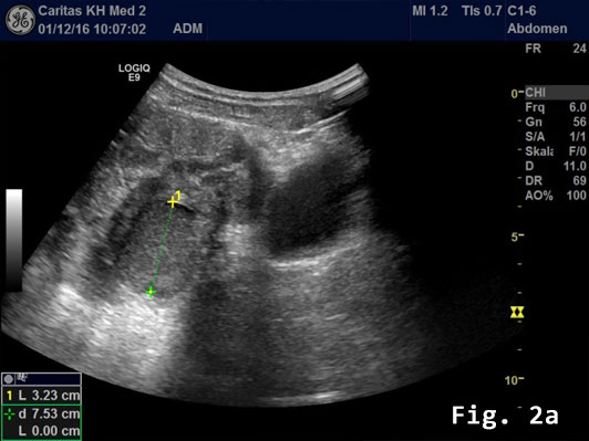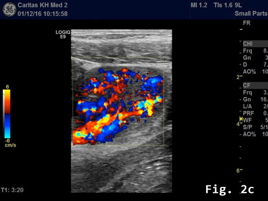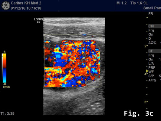 Transabdominal B-mode ultrasound (BMUS) confirmed a 40 mm sized heterogeneous hy-poechoic lesion infiltrating the sigmoid colon [Figure 2].