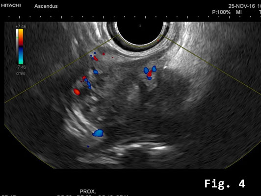 Endorectal endoscopic ultrasound of the sigmoid colon revealed transmural extension of the mass and confirmed the transcutaneous finding. The lesion was well vascularized [Figure 2].