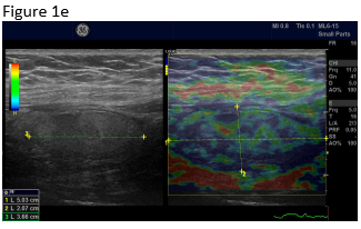Figure 3: A follow up examination few weeks later revealed partially revascularised omental tissue in a now asymptomatic patient (a,b). Shear wave elastography is shown where there is now only relatively soft (inflammatory) tissue (c).