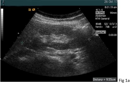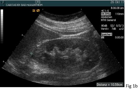 A 37 yo female patient suffered from chronic headaches. She was examined by a neurologist who diagnosed fibromyalgia. Her family practioner also diagnosed severe arterial hypertension (so-called “non dipper”) and excluded hyperaldosteronism, hyperthyroidism and sleep apnoea as secondary causes. Anti-hypertensive medication was initiated with amlodipine and ramipril. Although she is a smoker (> 20 py) there were no ultrasonic features of atherosclerosis. However, her estimated glomerular filtration rate was reduced (~68 ml/min/1,73m²). Auscultation also revealed a high frequent upper quadrant noise on the right side. The general practioners initial ultrasound showed a significant difference in the size and resistive index (RI) between the right and left kidney. For that reason, the patient was sent to our specialist hypertension center where the diagnosis of renal artery stenosis caused by fibromuscular dysplasia was confirmed.