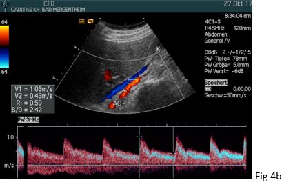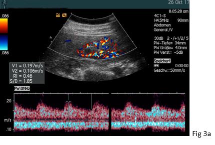 Figure 3: (a) The typical intrarenal interlobar poststenotic parvus-tardus spectrum is shown (RI 0.42 – 0.46) in comparison to the contralateral side (RI 0.62 - 65).