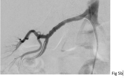 Figure 5: 37 year old female with fibromuscular dysplasia of the right renal artery. Digital subtraction angiography (DSA) showing the classical "string of beads" appearance of the right renal artery with stenosis in the mid segment in (a). DSA after ballon angioplasty without relevant stenosis in (b).