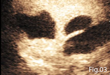 A Bolus of 2.4ml of SonoVue (Bracco, Milan) was administered through a cannula situated in the left antecubital fossa, followed by a 10ml bolus of saline solution. Both abscesses demonstrated peripheral enhancement with no uptake seen in the central fluid components (Figure 3). On further evaluation of the anterior gallbladder wall CEUS demonstrated a well-defined avascular defect providing a communication of the gallbladder contents with the adjacent hepatic abscess (Figure 4). These findings were conclusive of gallbladder wall perforation. A subsequent Computed Tomography confirmed this gallbladder perforation and hepatic abscess formation within segments V and V/VIII of the liver.