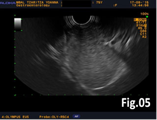 Figure 5: EUS of the gastric tumor: “dumbbell” shape, irregular hypoechoic zones and microcysts, high-risk GIST suspected.