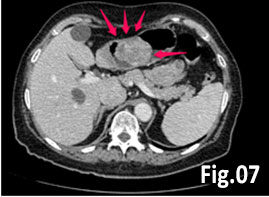 Figure 7. CT(CECT): Hyperenhanced tumor with heterogeneous structure, sized 68х57x45 mm, probably GIST. No significant lymph nodes or secondary lesions. Small simple liver cysts.