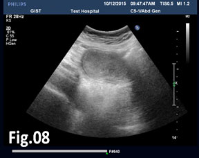 Figure 3: Abdominal ultrasound: a solid hypoechoic oval tumor arising from the gastric wall