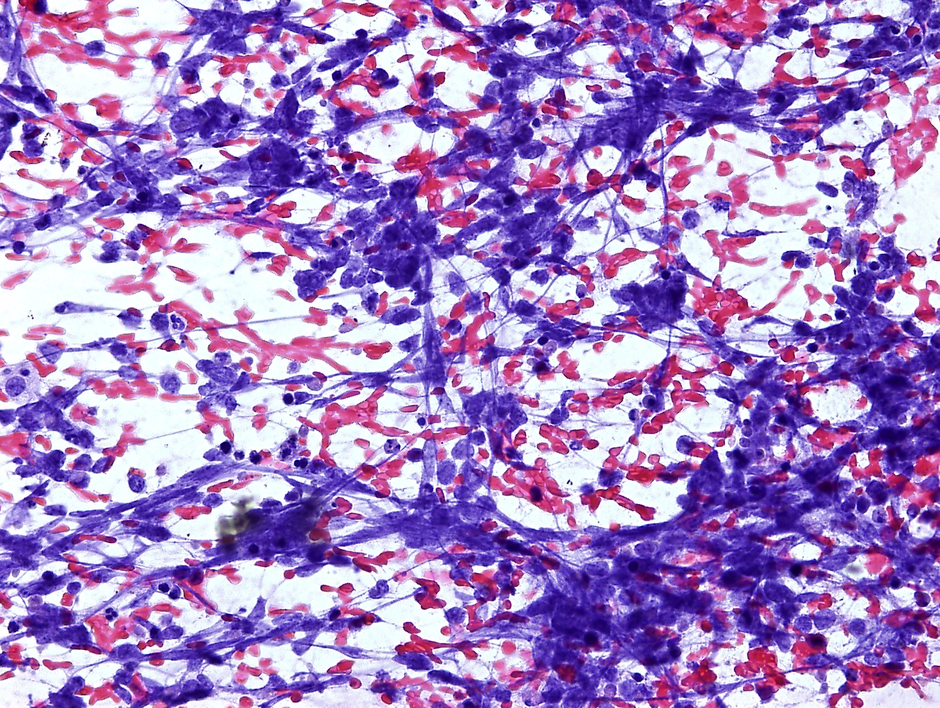 The left inguinal region was investigated, to rule out any regional lymph-node metastasis. In the groin we could find an enlarged lymph-node, measuring 34x14 mm. This lymph-node exhibit a focal hypoechoic nodule in the cortex, which measured 20x11 mm. At power-Doppler imaging this tumor deposit had an intense and anarchic vascularization. A sonography-guided fine-needle aspiration (FNA) of the focal nodule was carried out. Cytology and immunocytology evaluation allowed to diagnose a lymph-node metastasis from Merkel cell carcinoma (MCC).