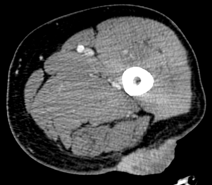 The patient underwent staging with whole-body, contrast-enhanced computed tomography (CT). CT confirmed the thigh lesion and the lymph-node metastasis but allowed to rule out any distant metastasis. The patient underwent successfully surgery, with wide excision of the primary thigh tumor and with left groin radical lymphadenectomy. The patient is now free of recurrence at two years from surgery.