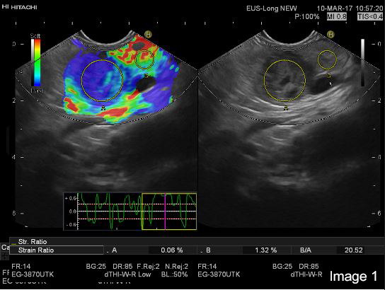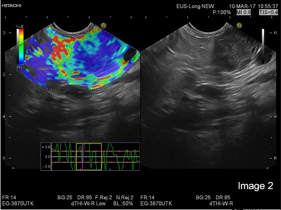 On strain based elastography, the tumour tissue was repeatedly imaged as harder than the surrounding pancreatic parenchyma (Image 1 and 2).