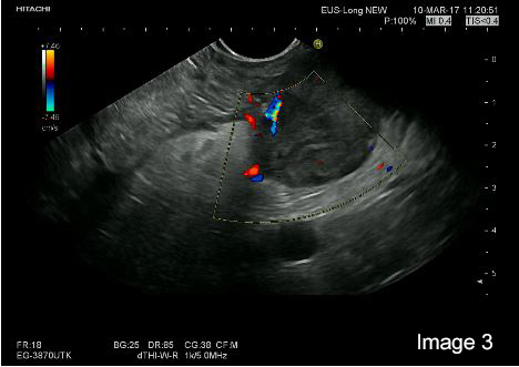 On colour-Doppler a “basket sign” was visible with several vessels highlighting the immediate surrounding tissue (Image 3).
