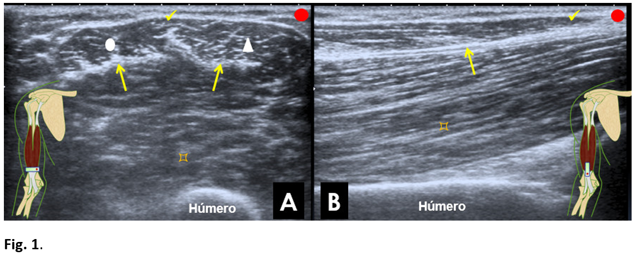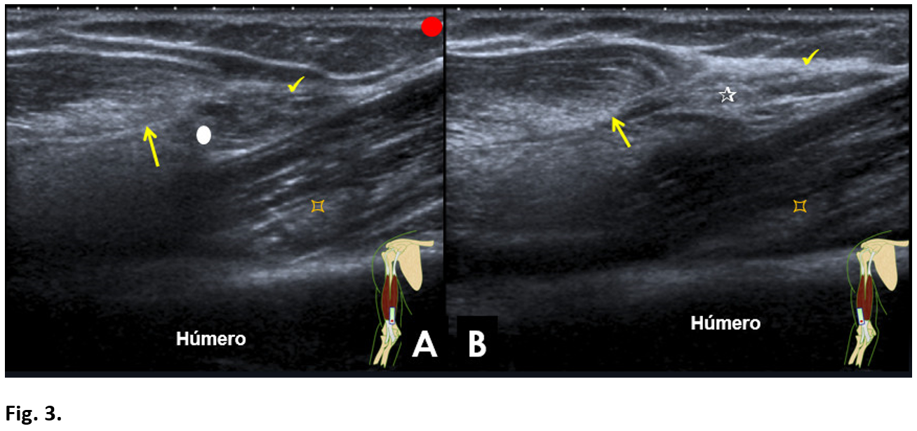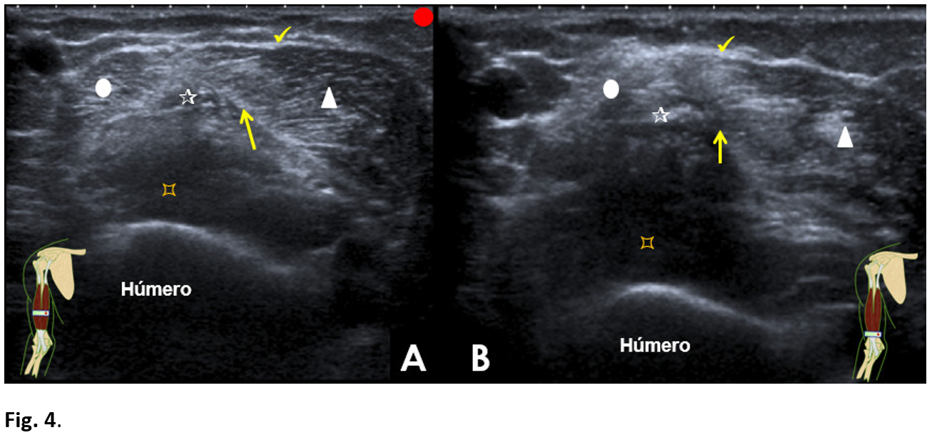 In the axial or transverse section on the distal third of the forearm (Fig. 4A and B), a significant atrophy of the long (outermost) portion was observed. In the immediate deep plane, the hyperechogenic, stellate, retractable image corresponds to the fibrous scar.