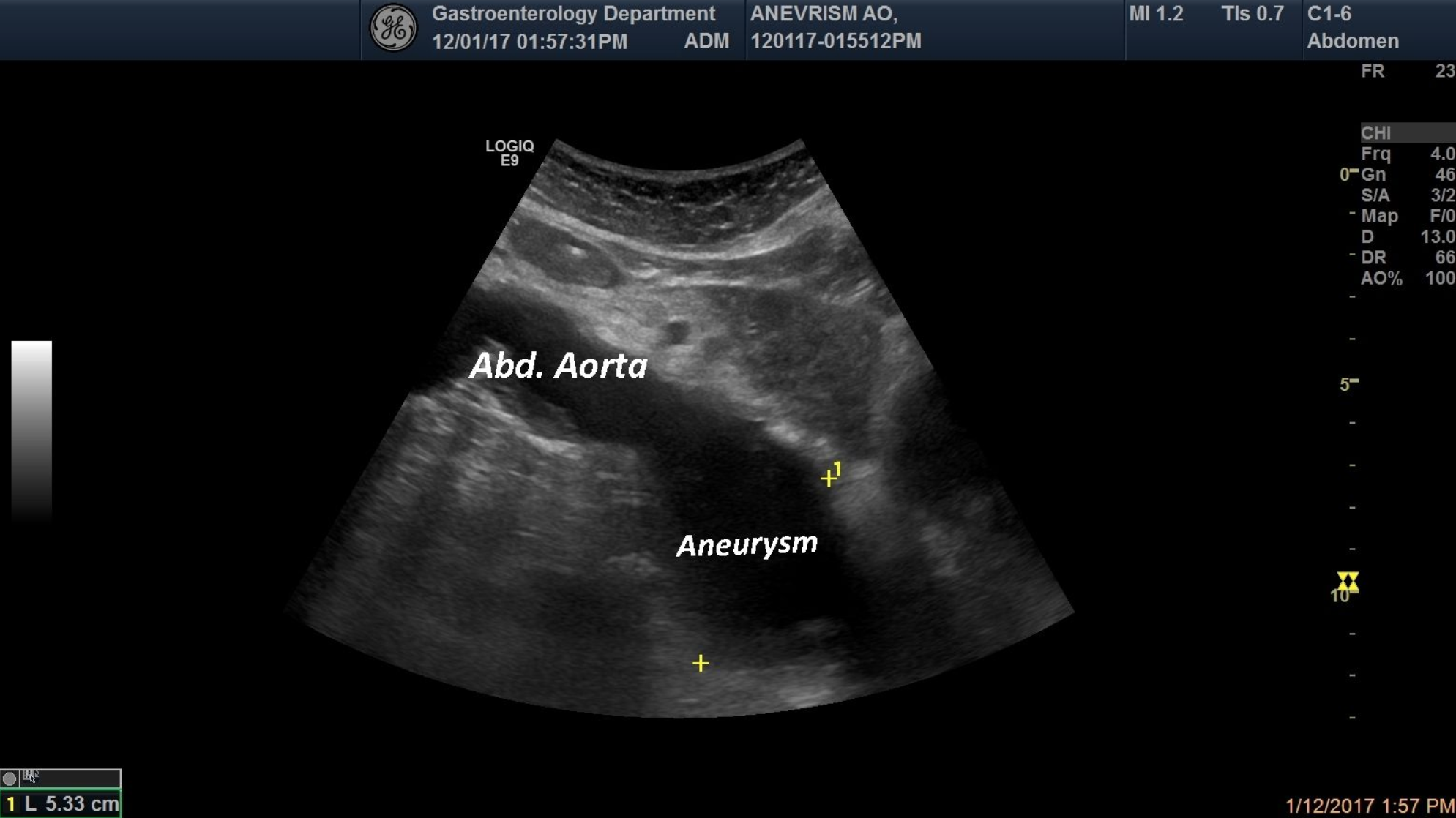 Abdominal Aorta Aneurysm [1 image] Categories Abdominal vesselsAortaBASIC ULTRASOUND IMAGES TITLE: Abdominal Aorta Aneurysm DESCRIPTION: In this picture the Abdominal Aortais displayed, where anAorticAneurysmof 5.3 cm is seenin an asymptomatic patient. EMAIL CONTACT:moga.tudor@yahoo.com KEYWORDS:Aorta, Aneurysm Related postsJanuary 5, 2021Walled-off pancreatic necrosis [2 images]Read more