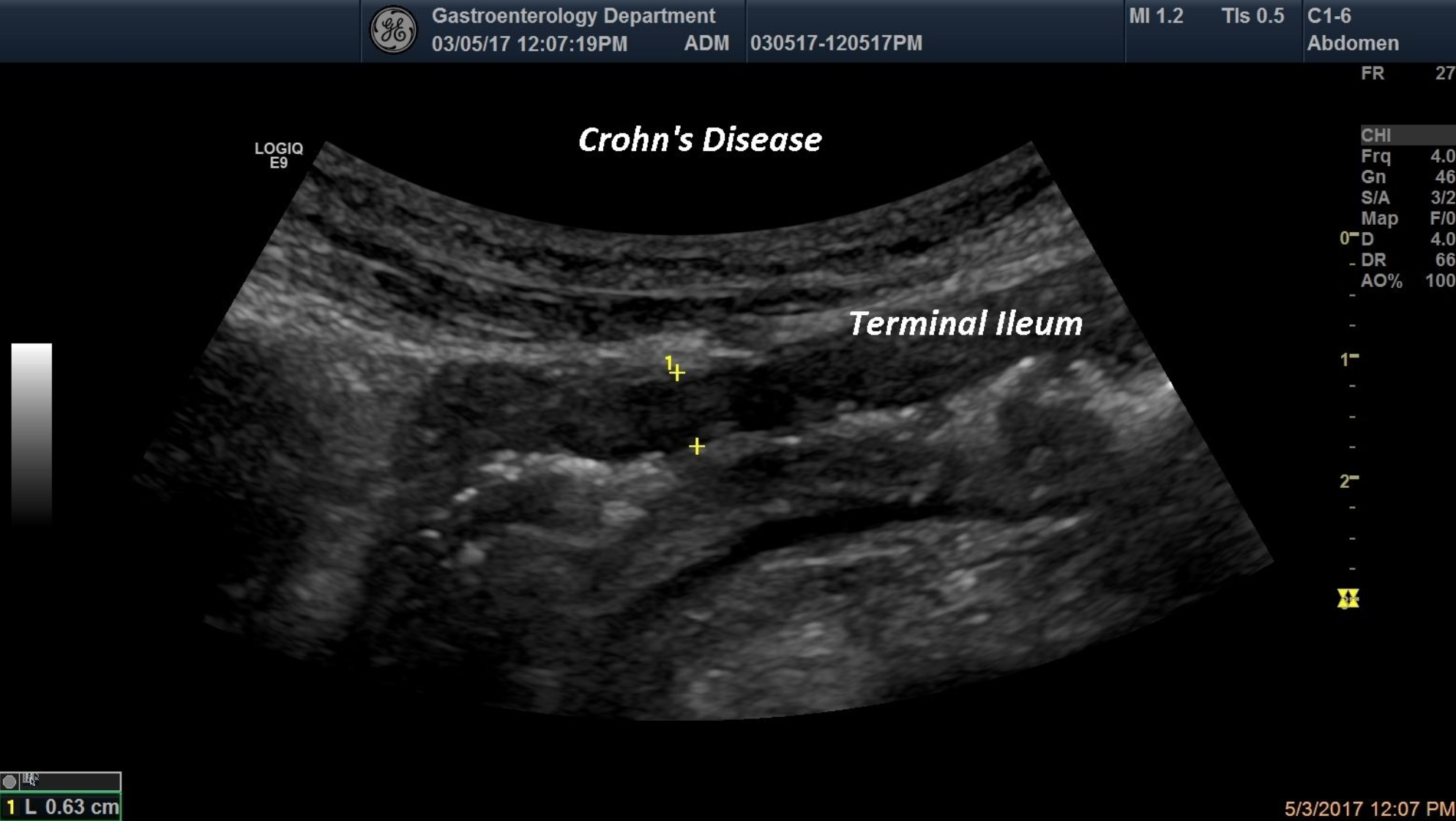 In this ultrasound picture is pointed out the wall thickening and the loss of the multi layer pattern of the terminal ileumin a young patient with chronic diarrhea.