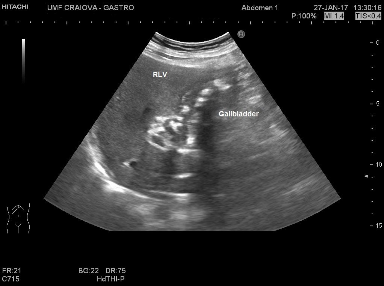 65 year old male. Dilatated gallbladder, inhomogenous structure of the walls, with an important amount of sludge and gallstones.