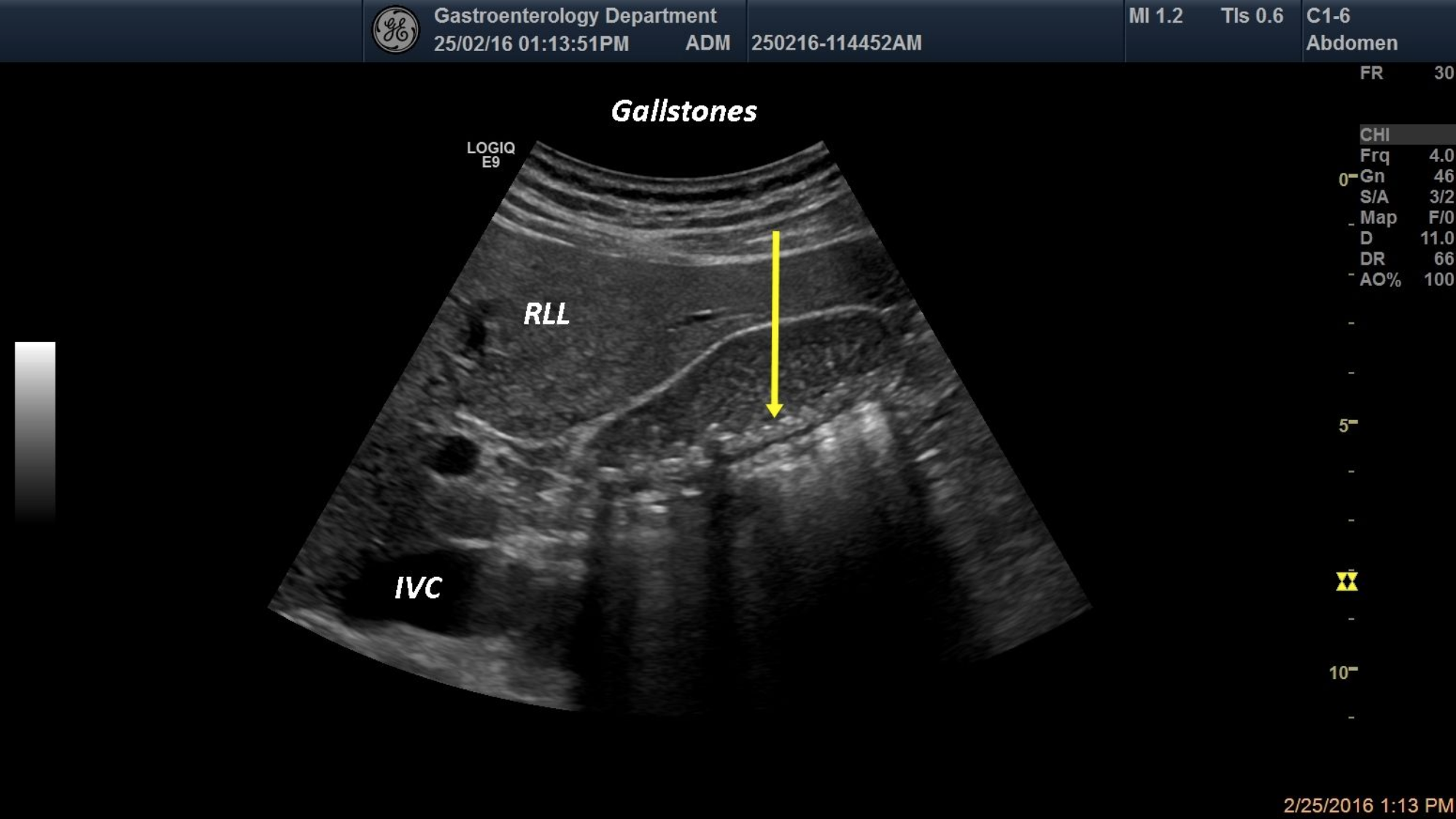 A-58-year old patient with multiple colicky pain was referred for a standard ultrasound. In the displayed image, multiple hyperechoic structures with posterior shadowing (gallstones) and biliary sludge are shown.