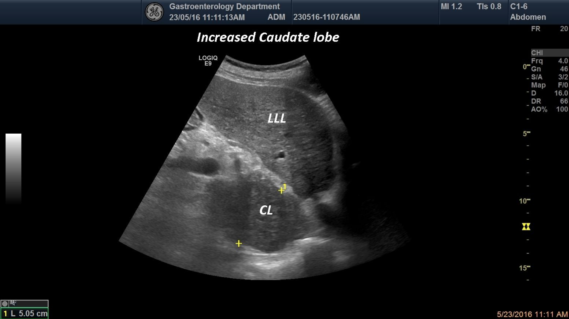 A patient was referred to the Gastroenterology department for an ultrasound evaluation. We depicted an increased caudate lobe. The diagnosis of advance liver fibrosis was confirmed after an elastographic method was performed.
