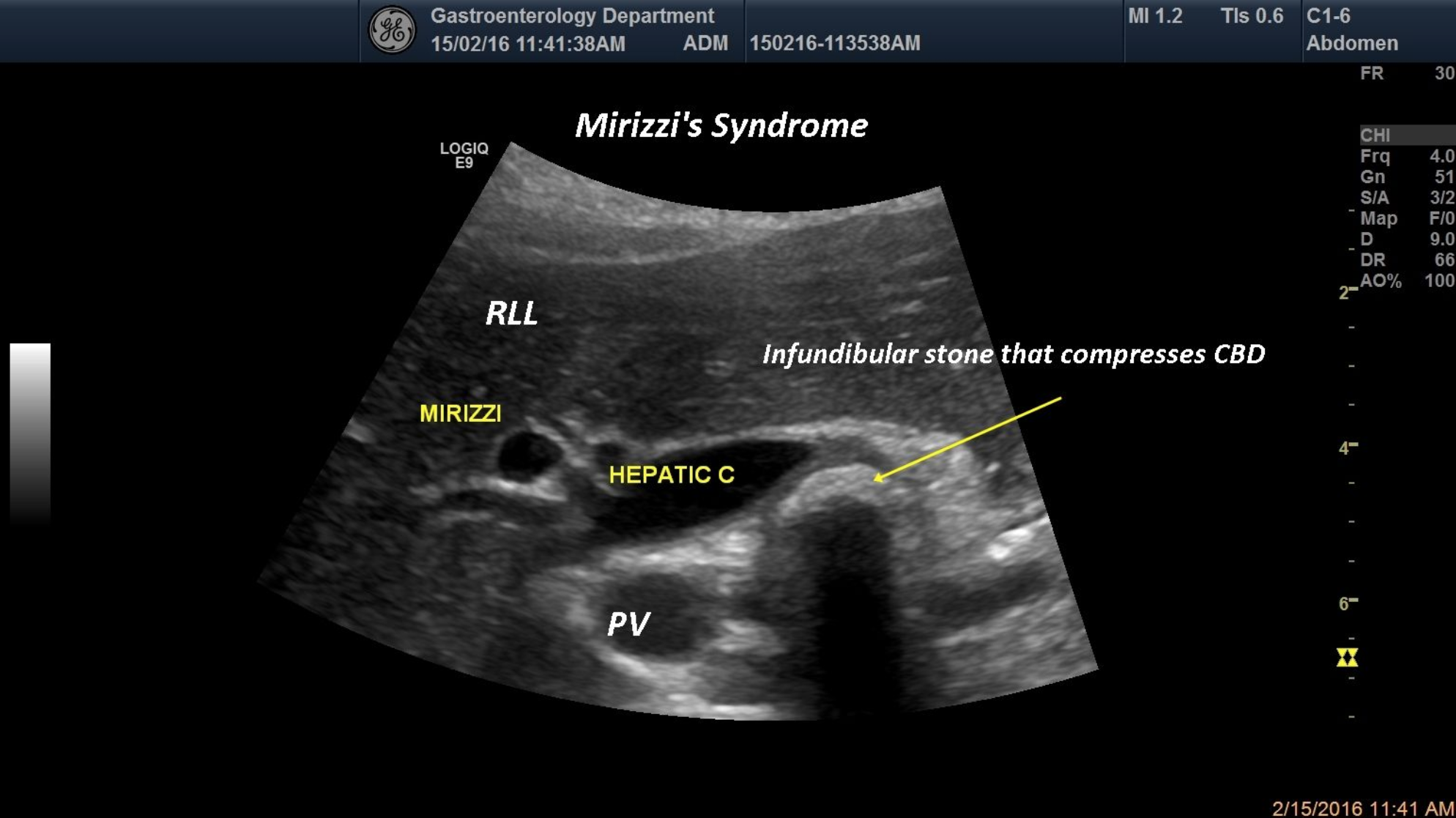An 49-year-old patient was referred for jaundice and epigastric pain with acute onset. An infundibular impacted gallstone that compresses the CBD thus producing obstructive jaundice,was revealed by standard ultrasound.