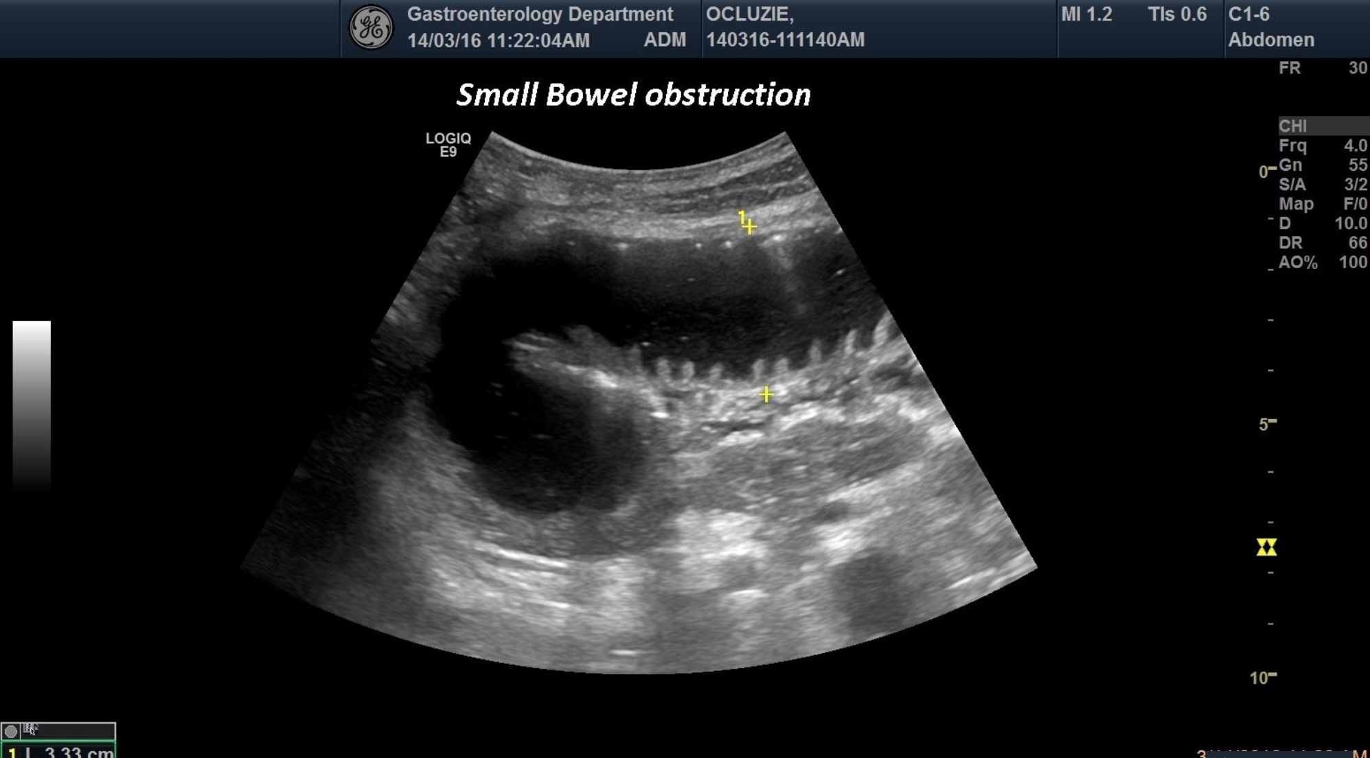 An 73 years old patient was referred to our department for abdominal pain and severe vomiting.At ultrasound evaluation, we depicted distended small bowel lumen with anechoic content and lack of peristalsis.