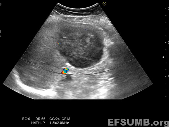 B-mode ultrasound shows splenomegaly and a solid mass tumor: a large hypoechoic focal lesion located near the splenic hillum.