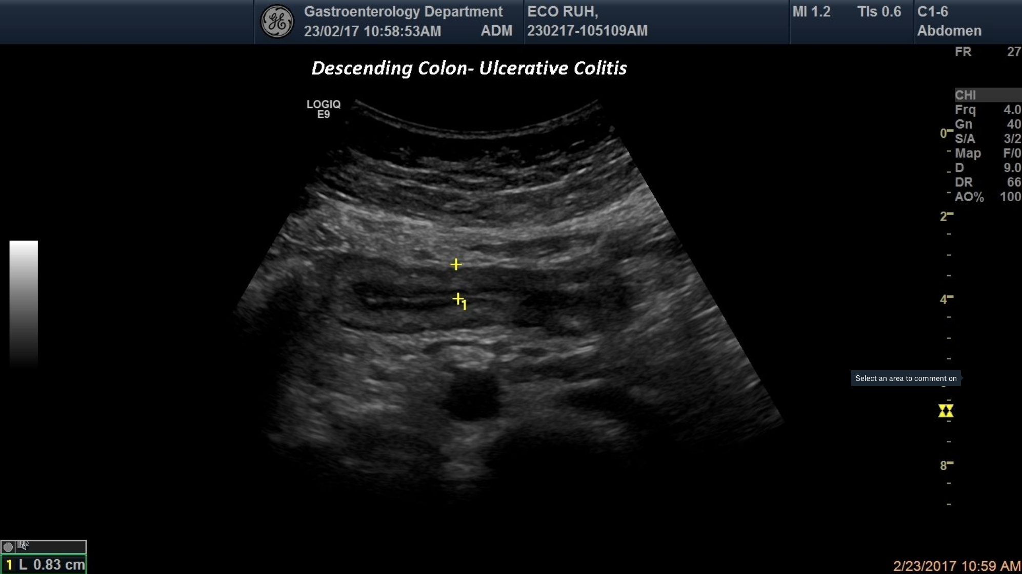 A patient with bloody diarrhea and abdominal pain was sent to our department for a checkup. Abdominal ultrasound was performed and depicted a wall thickening of the descending colon and the loss of the multi layer pattern. Later on colonoscopy with biopsy was performed that proved the diagnosis of ulcerative colitis of the descending colon.