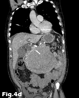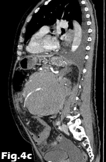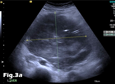 Initial investigation with US of the scrotum revealed dilated (maximally 5.3mm) left pampiniform plexus with retrograde flow on Doppler ultrasound and Valsalva manoeuvre, consistent with an extensive unilateral varicocele (Fig. 1 and 2). Subsequent abdominal ultrasound demonstrated moderate ascites, dilated common bile duct, large right sided pleural effusion and a large 14x14cm solid, vascular epigastric mass. This prompted urgent surgical referral and further cross-sectional imaging (Fig. 3).