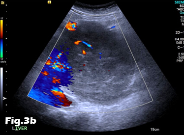 Figure 3:A, B: Abdominal ultrasound images revealing the presence of a heterogeneous epigastric mass demonstrating internal vascularity on Colour Doppler imaging.