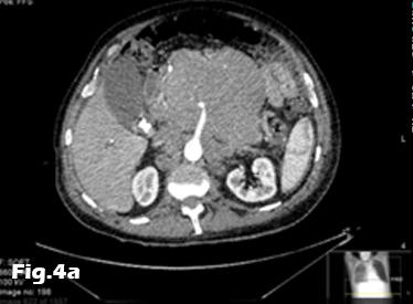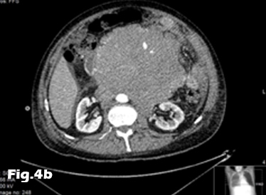 CT abdomen showed a large soft tissue density retro-peritoneal mass obliterating the portal mesenteric vein circulation and causing the left varicosity (Fig. 4). Ultrasound guided biopsy of the central abdominal mass confirmed a Stage IV Mantle cell Lymphoma.
