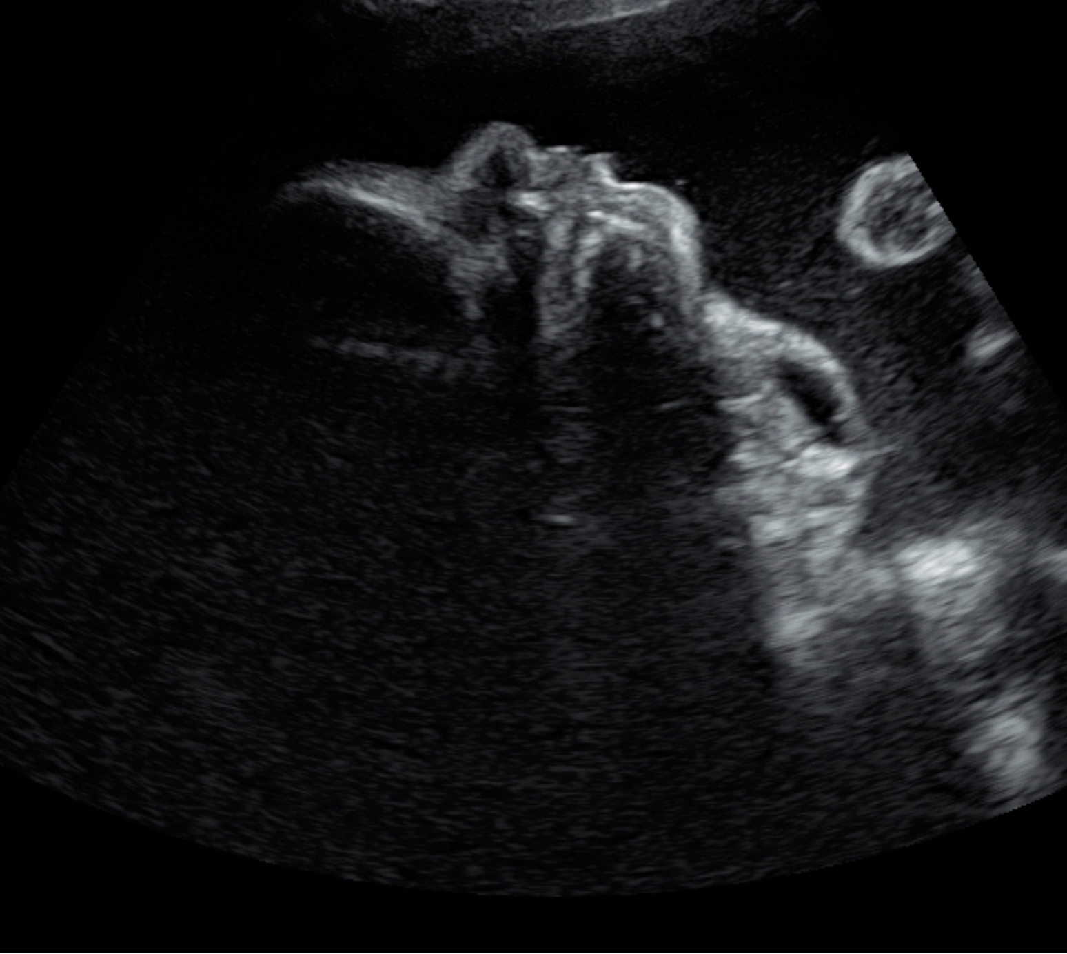 The sonogram shows a fetal head and the cervical area of the fetus in a sagittal plane. One can see that the fetal neck has a huge area with teratoma which has a size about 8x10 cm. Furthermore, one can see the fetal profile with chin and fetal nose.
