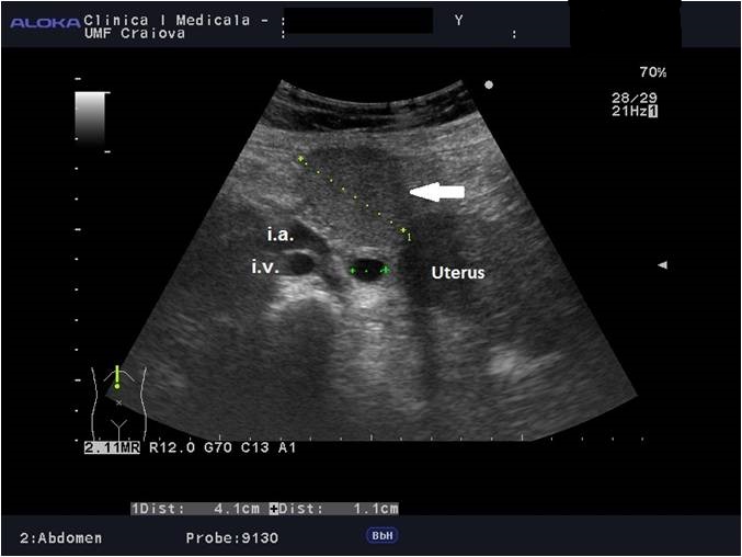 Transabdominal ultrasound revealed a left adnexial mass, well defined, isoechoic, 4/5 cm in diameter, anterior of iliac vesseles, with color Doppler flow within the mass.