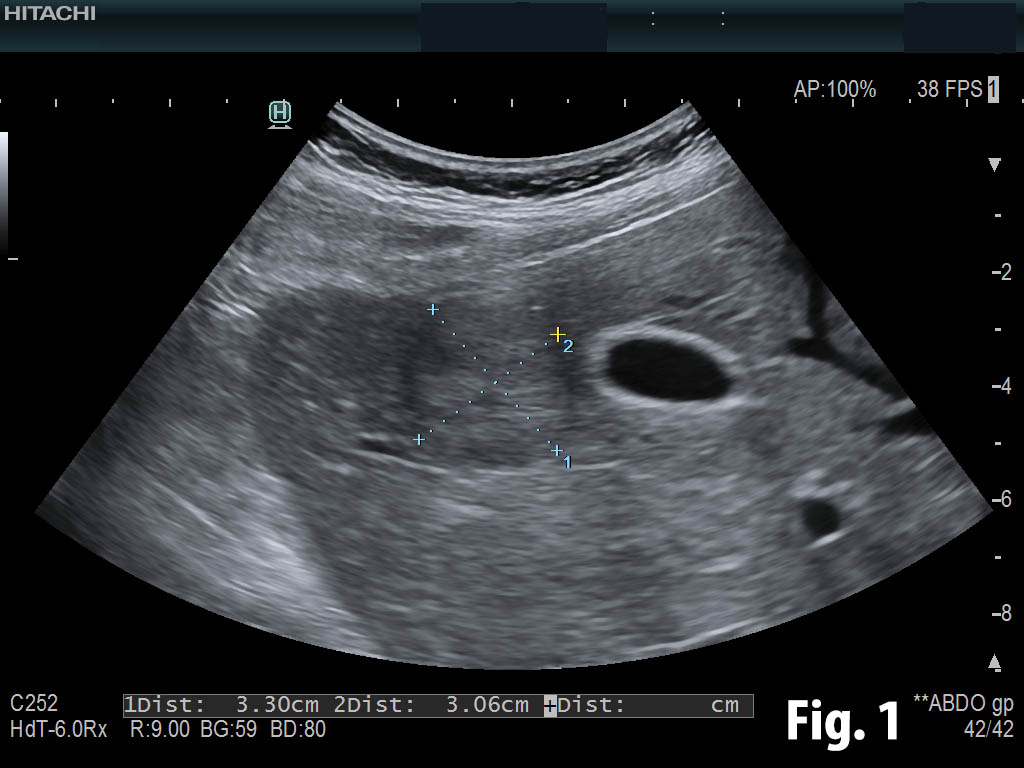 In this case, focal nodular hyperplasia (FNH) appears as a nearly isoechoic mass with a characteristic central scar and displacement of peripheral vasculature on color Doppler examination (”spokewheel vascularity”).