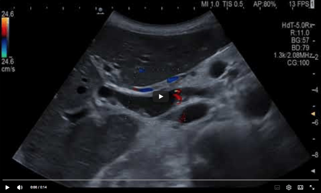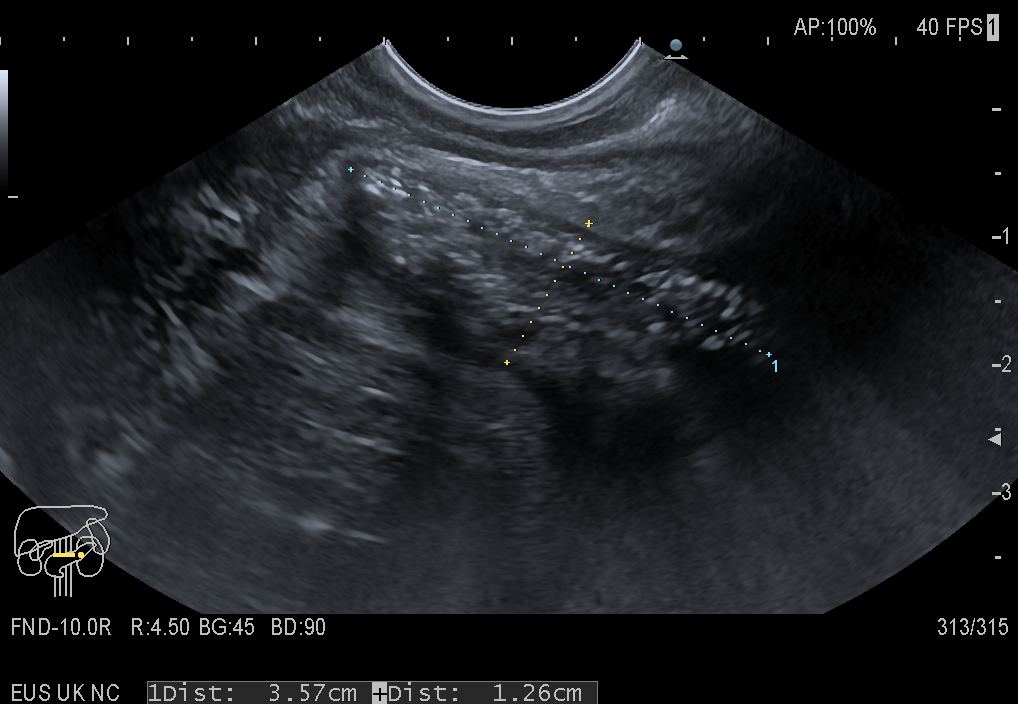 Endorectal ultrasound (ERUS) performed with a linear flexible EUS scope shows a well-defined, circumscribed, collection filled with mixed hypoechoic and hyperechoic content (Image 1 + 2). Intravenous CEUS (4.8 mL) depicted uptake of the ultrasound contrast agent inside various septations and granulation tissue in the collection (Video 1). Transrectal injection of diluted Sonovue (0.2 mL in 10 mL of saline) depicted the extent of the pararectal collection which communicated with a cranial and caudal fistula (Video 2). The EUS-guided aspirate yielded pus, with later growth of Enterobacter + anaerobe species. Last but not least, perineal CEUS examination with a convex probe showed the horseshoe abscess surrounding the rectum (Video 3).