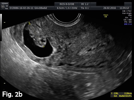 Figure 2b. A gestational sac with one live embryo (CRL measuring 2.20 cm, corresponding to 8 weeks 6 days amenorrhea) located in right interstitial area.