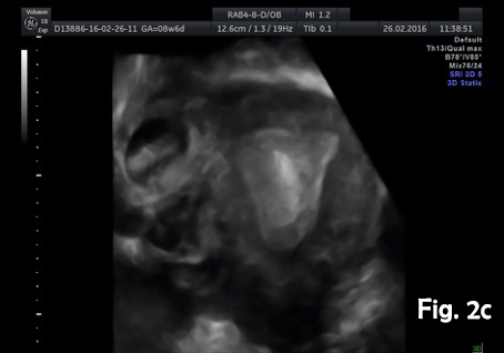 A 39-year-old woman presented for a routine dating scan at 8 weeks 6 days amenorrhea. At examination she also was asymptomatic. Ultrasound examination revealed an empty uterine cavity with a regular endometrium and a gestational sac with a viable embryo located in the interstitial portion of the right fallopian tubes, separate and greater than 1 cm from the lateral edge of the uterine cavity (Fig.2a). The sac was surrounded by a thin myometrial mantle (Fig.2b). Color Doppler sonography revealed peritrophoblastic blood flow around the gestational sac and heart movements (Video 1). No fluid was seen in the pouch of Douglas. Bulging of the outer contour of the uterus in the cornual region was shown on 3D ultrasound (Fig.2c). Laparotomy with excision of the interstitial portion of fallopian tube and right cornual part of the uterus was performed. The postoperative period was uncomplicated.
