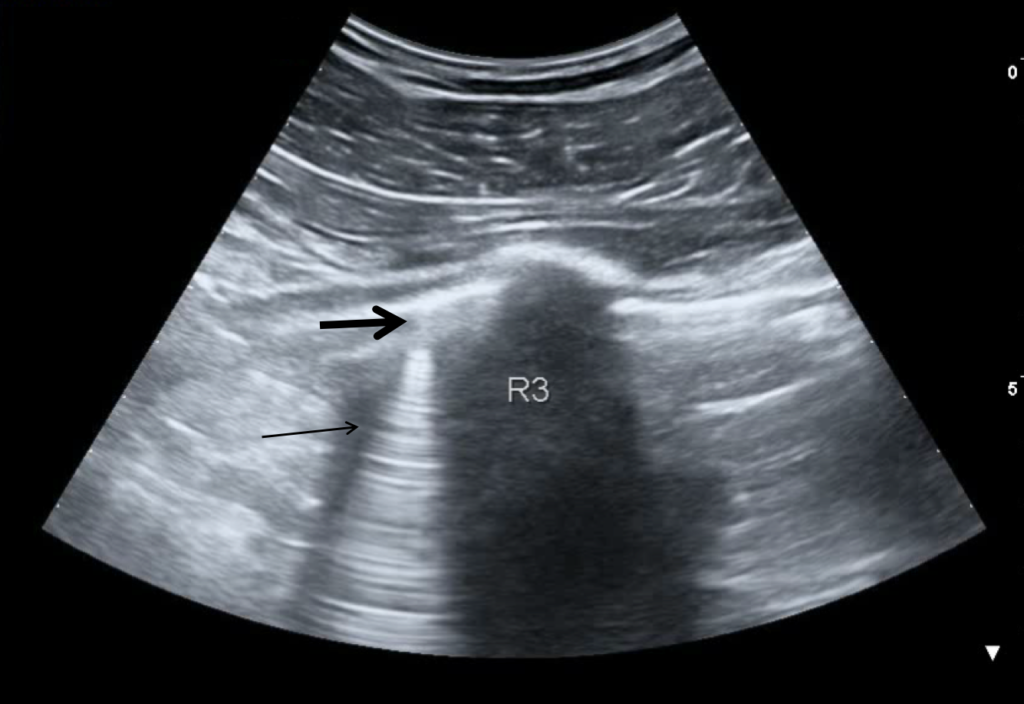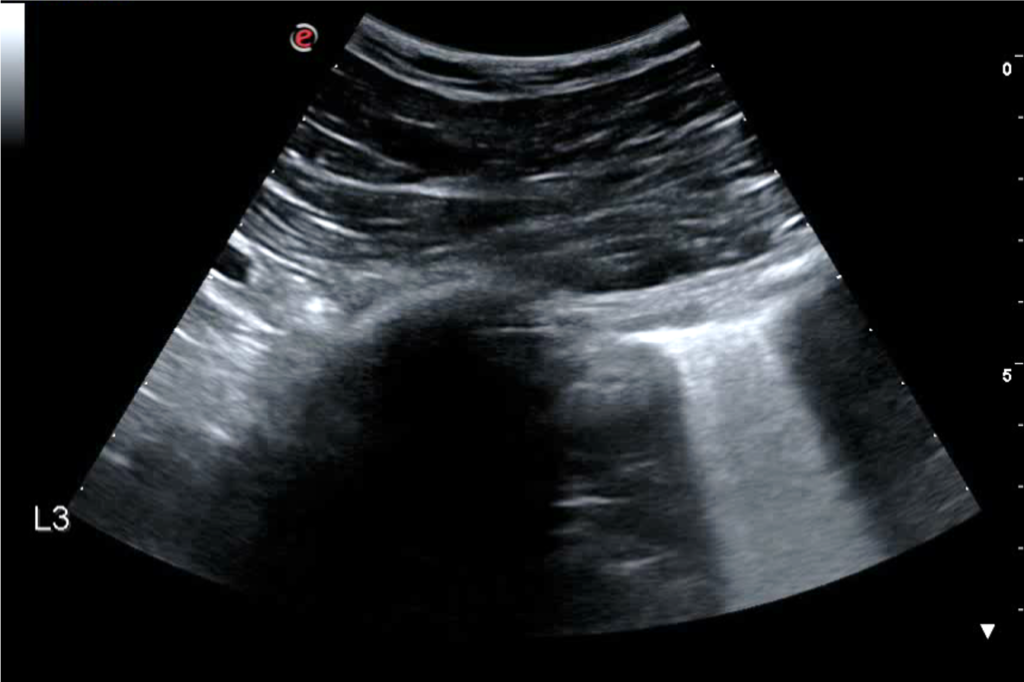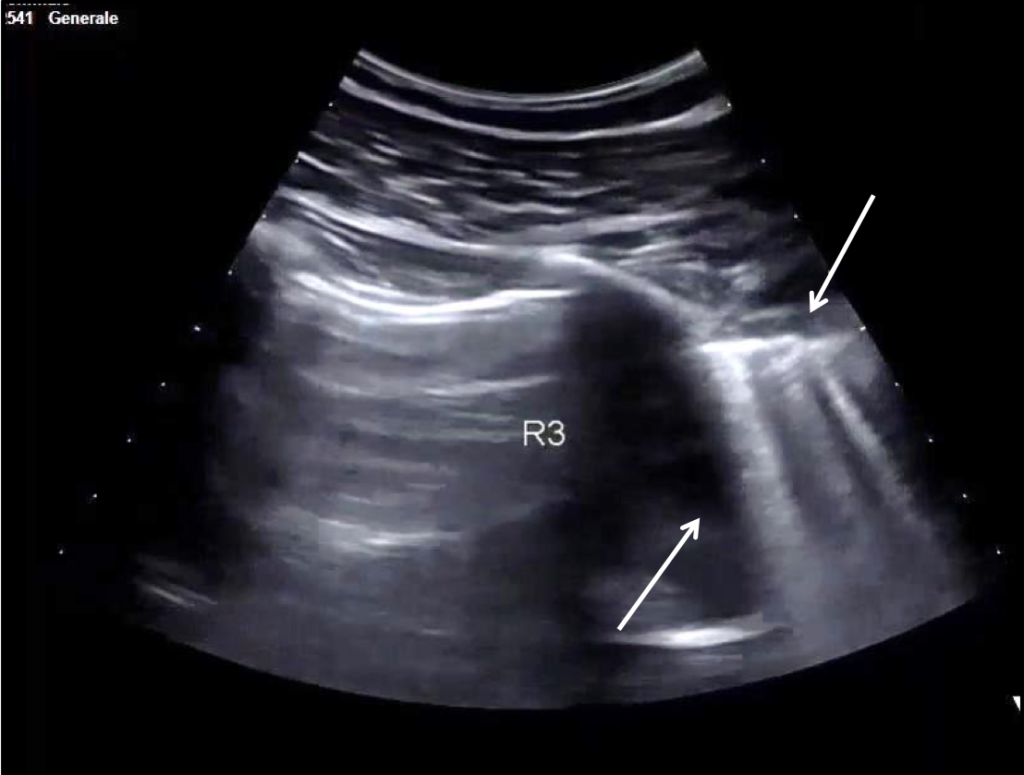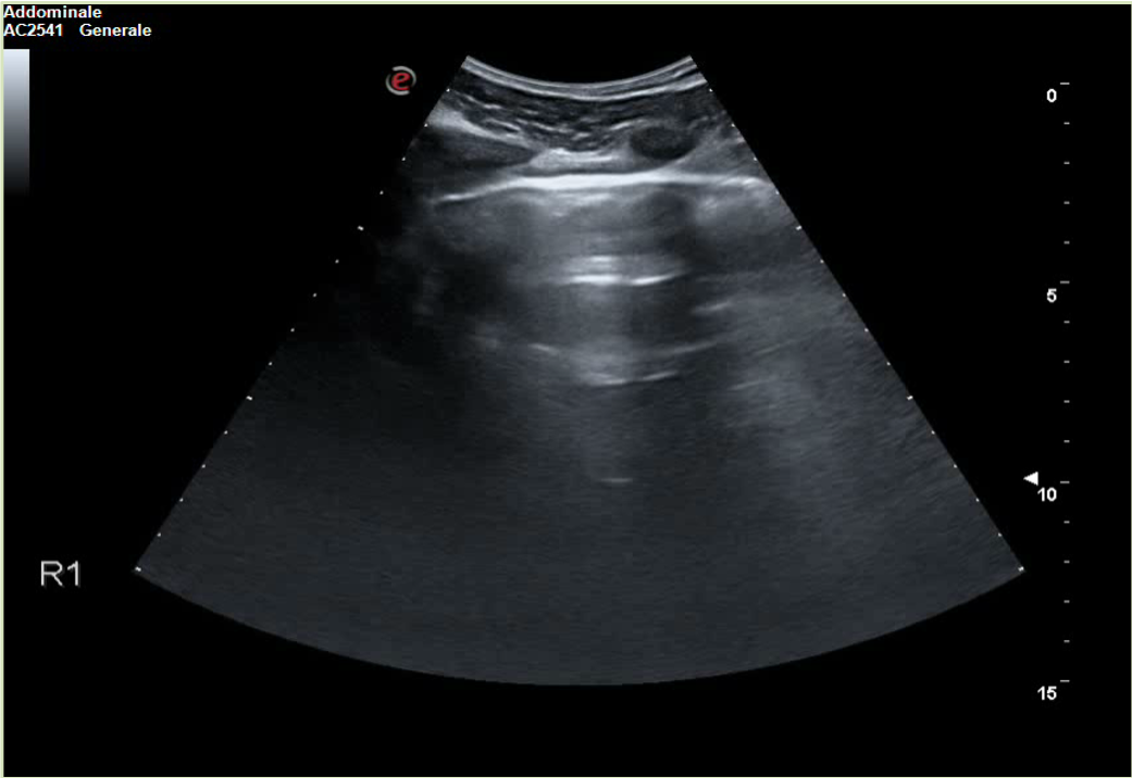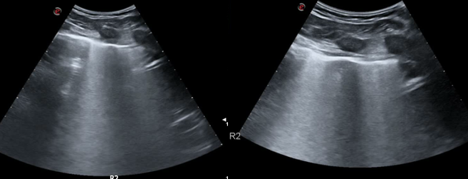A 30-year-old man presents to the emergency department (ED) due to syncope. For the last 10 days he had had fever, cough and dyspnea. At the ED his peripheral oxygen saturation was 86%, BP 130/80, HR 88bpm, RR 20 /min and his temperature 37.4°C. He was given oxygen via a mask. Chest CT was performed and later lung ultrasound (LUS) was performed in 12 areas longitudinal/oblique views using a convex array probe followed by a linear array probe for details (figure 1).