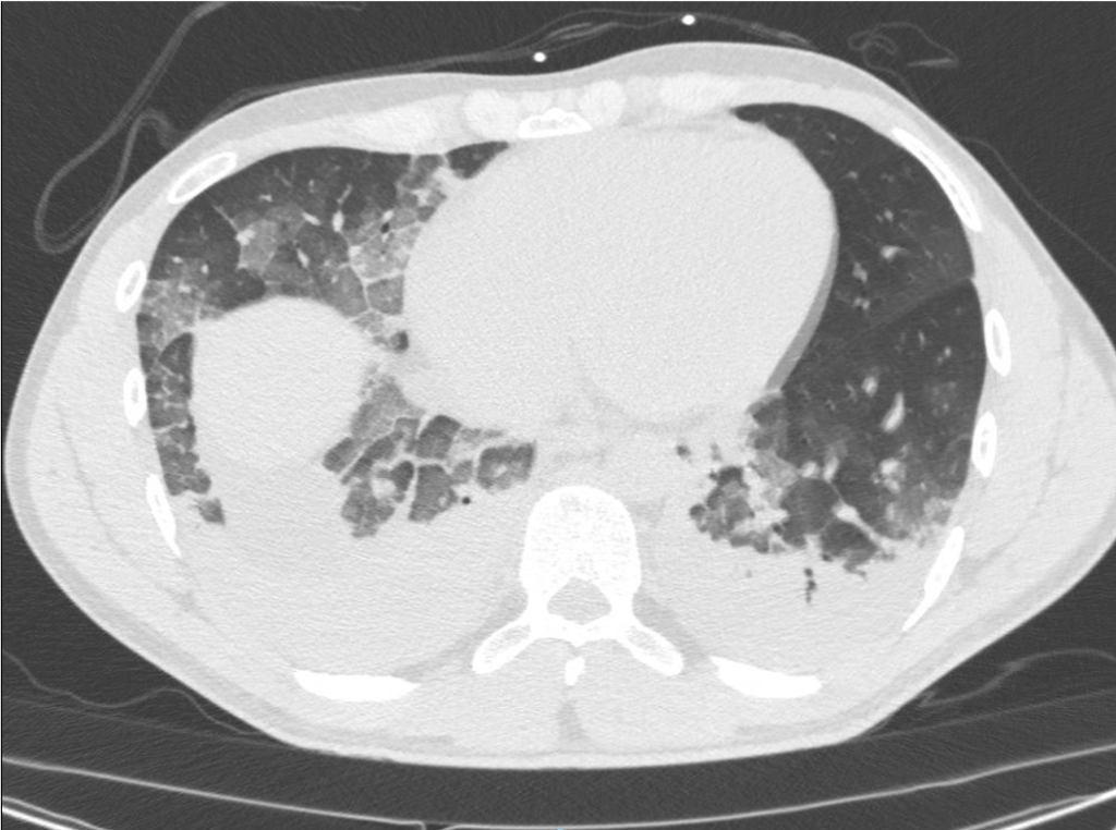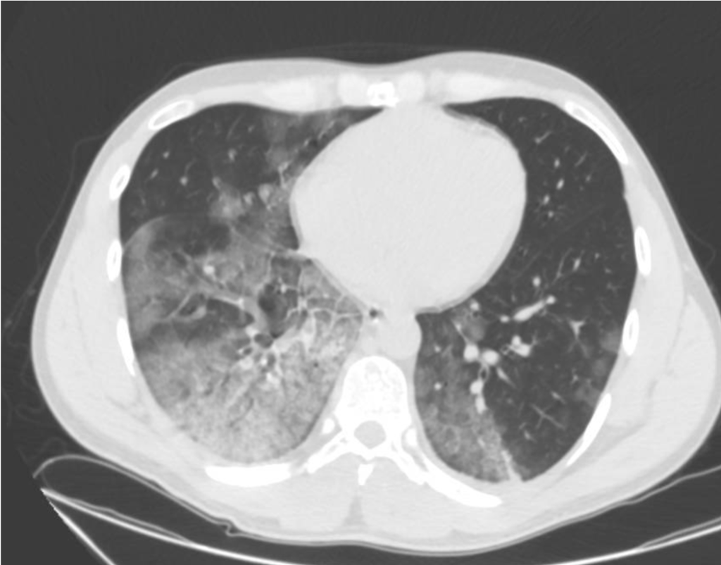 The patient tested positive for SARS-COV-2. On day 2 after admission the patient’s condition deteriorated, and he was transferred to the ICU. Another chest CT was performed. We show the ultrasound and CT images with corresponding legends (image 1-7 + video 1) and discuss the findings in relation to the diagnostic work-up of COVID-19 pneumonia.