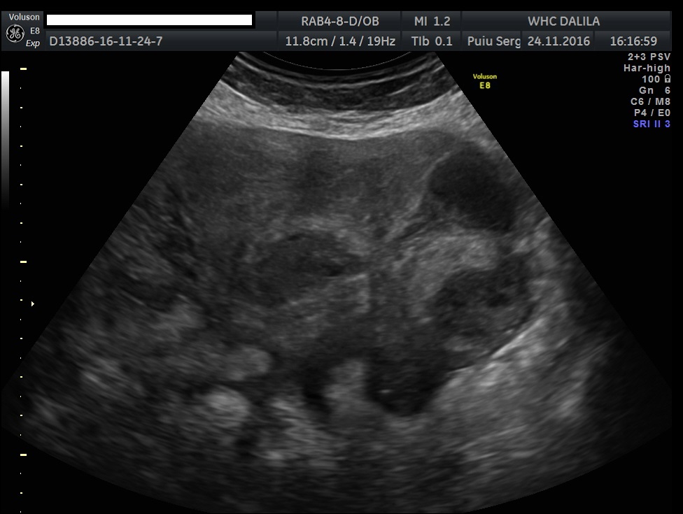 During the acute stage, the dilated by purulent exudate fallopian tubes with thickened walls (5 mm or thicker) and endosalpingeal folds, presents specific ultrasonographic markers of salpingitis/pyosalpinx, as ‘cogwheel’ sign, ovoid/retort tubal shape, incomplete septa. Hyperemia of the fallopian tube walls is seen on color Doppler [17]. Some exudate and infectious pathogens may spill into the pelvis. The ovary may become involved by invasion of organisms through the ovulation site. Necrosis inside this complex mass may result in one or more abscess cavities [18].