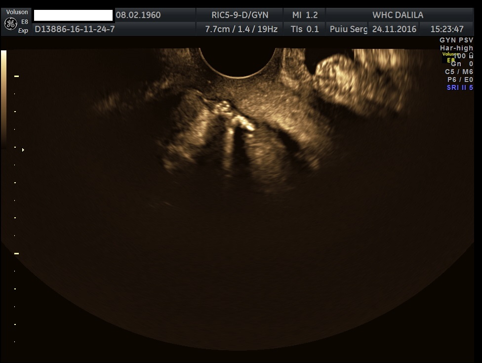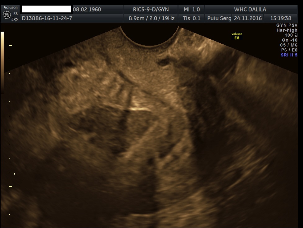 Video 1. Transvaginal scan. Fluid movements through fistula canal between TOA and uterine cavity are clearly seen when a gently pressure by ultrasound probe is applied.