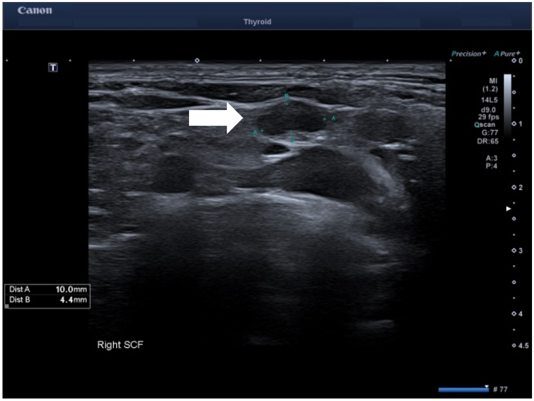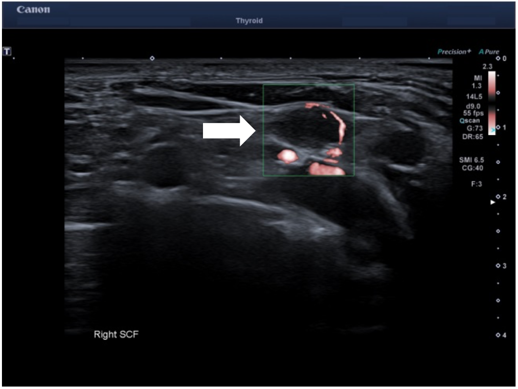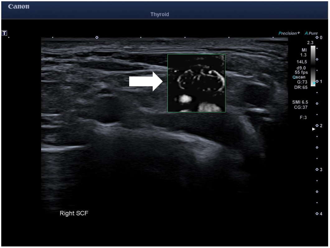 Longitudinal ultrasound of right supraclavicular fossa showed a small 10 x 4 mm lymph node in the right supraclavicular fossa (SCF) with mild cortical thickening. SMI revealed abnormal peripheral vascularity which made it suspicious for metastatic infiltration and most likely represented the metabolically active SCF node on the recent PET imaging.