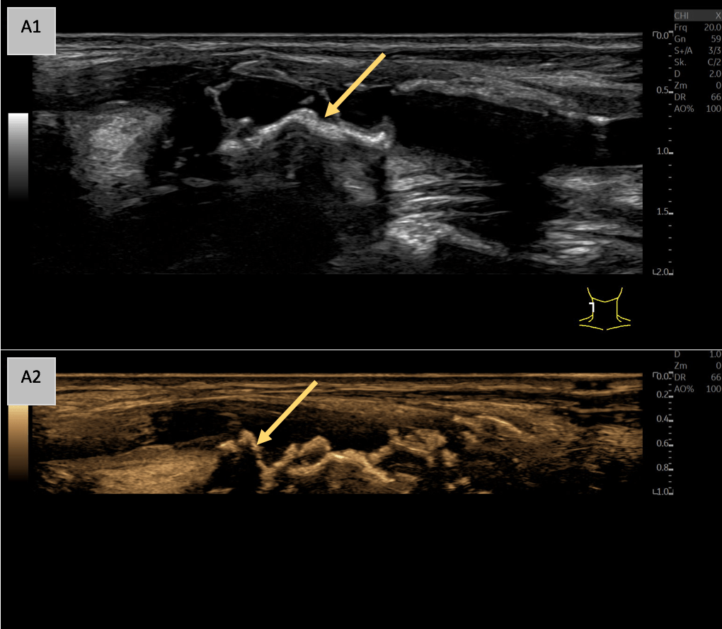 A: B-Mode imaging in the sagittal plane (A1) shows a markedly echogenic and inhomogeneous vessel wall of the common carotid artery with a thickened intima-media complex and irregular echogenic wall changes. Notably, multiple echogenic, wall-adherent formations with partial distal acoustic shadowing are observed (yellow arrow), indicative of significant plaque formation. Speckle Reduction Imaging (SRI) and Cross Beam techniques were employed to optimize the B-Mode image (A2), which is illustrated in sepia for enhanced visualization.