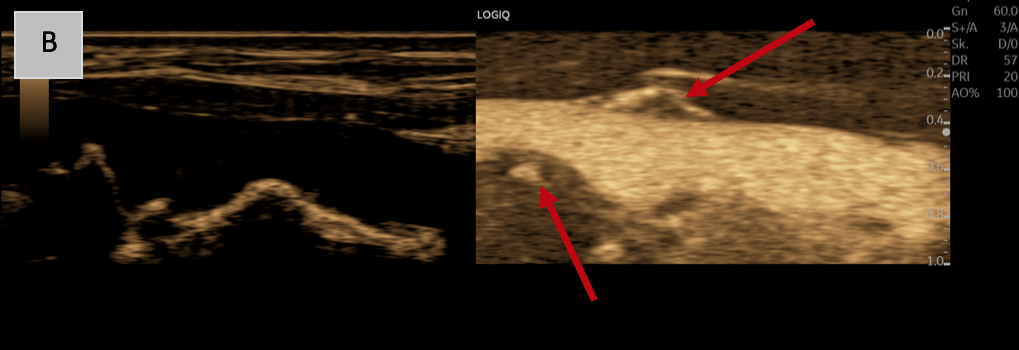 B: B-Mode in sepia and high-resolution flow imaging (B-Flow) along the longitudinal axis of the vessel reveals ulcerated plaque formations with notches and vasa vasorum showing transmural vascular ingrowth into the plaque (red arrow).