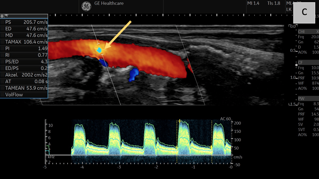 C: Triplex, B-Mode, and Duplex imaging with color coding and pulsed wave Doppler reveal significantly increased systolic flow velocities (>200 cm/s) in the CCA, accompanied by aliasing in the region of luminal narrowing (yellow arrow) caused by echogenic plaque formation.
