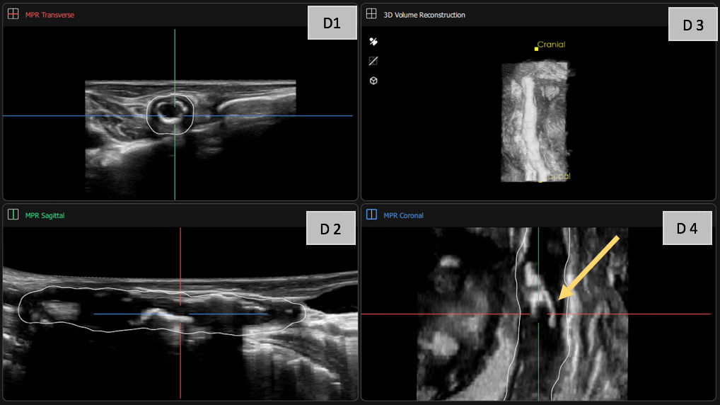 D: Visualization of the vessel with the PIUR tUS Infinity v4.1.2 General Imaging App in the transverse plane (D1), reconstructed sagittal plane (D2), and reconstructed coronal plane (D4). The coronal plane particularly highlights the vessel narrowing caused by the plaques (yellow arrow). The additional 3D reconstruction (D3) provides an "external" view of the multiple plaques, illustrating the resulting irregular vessel morphology.